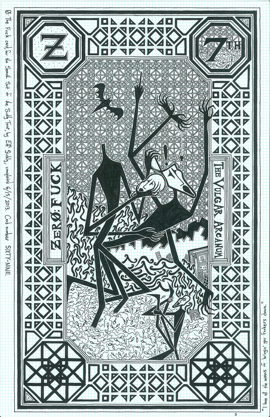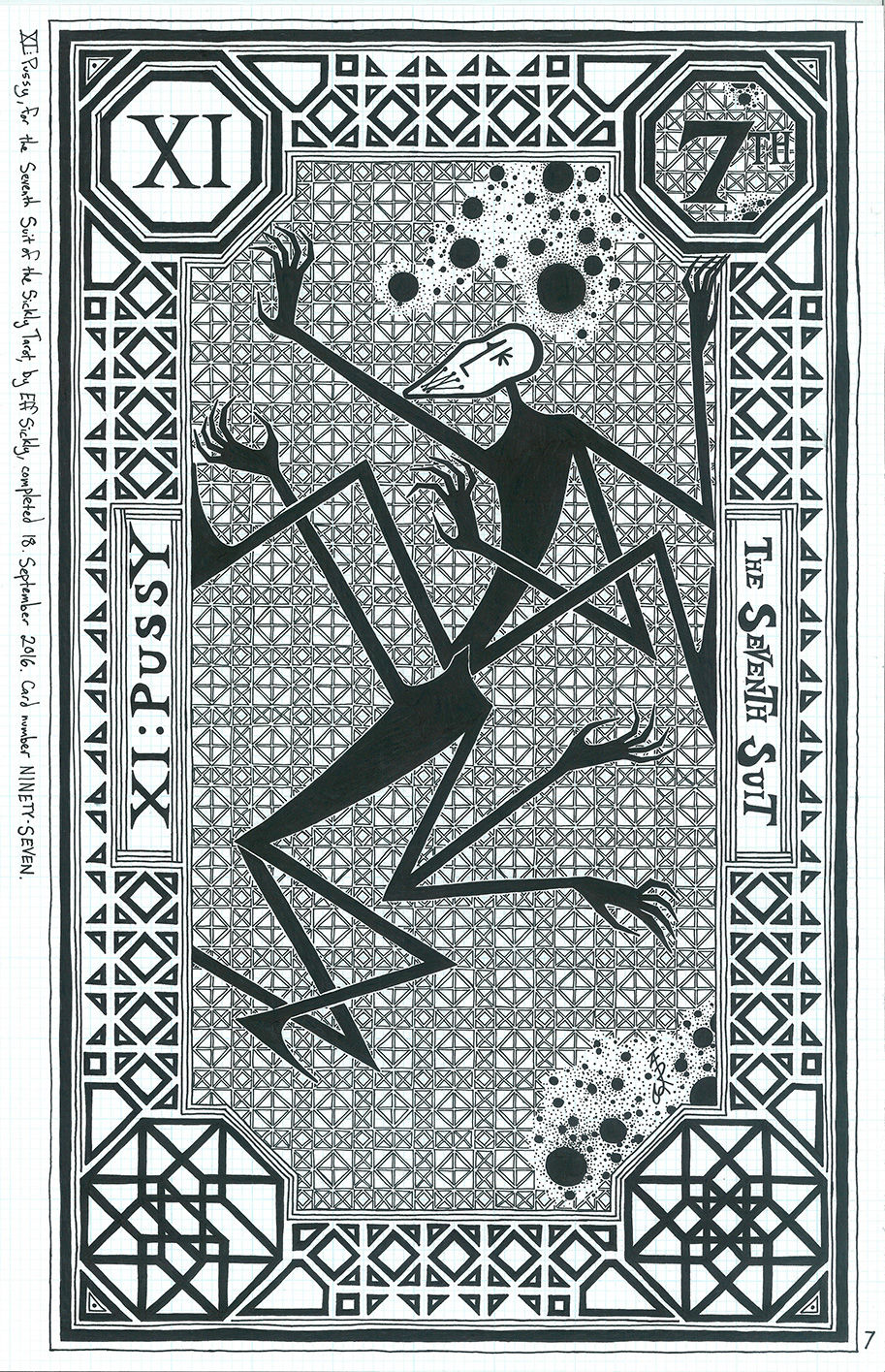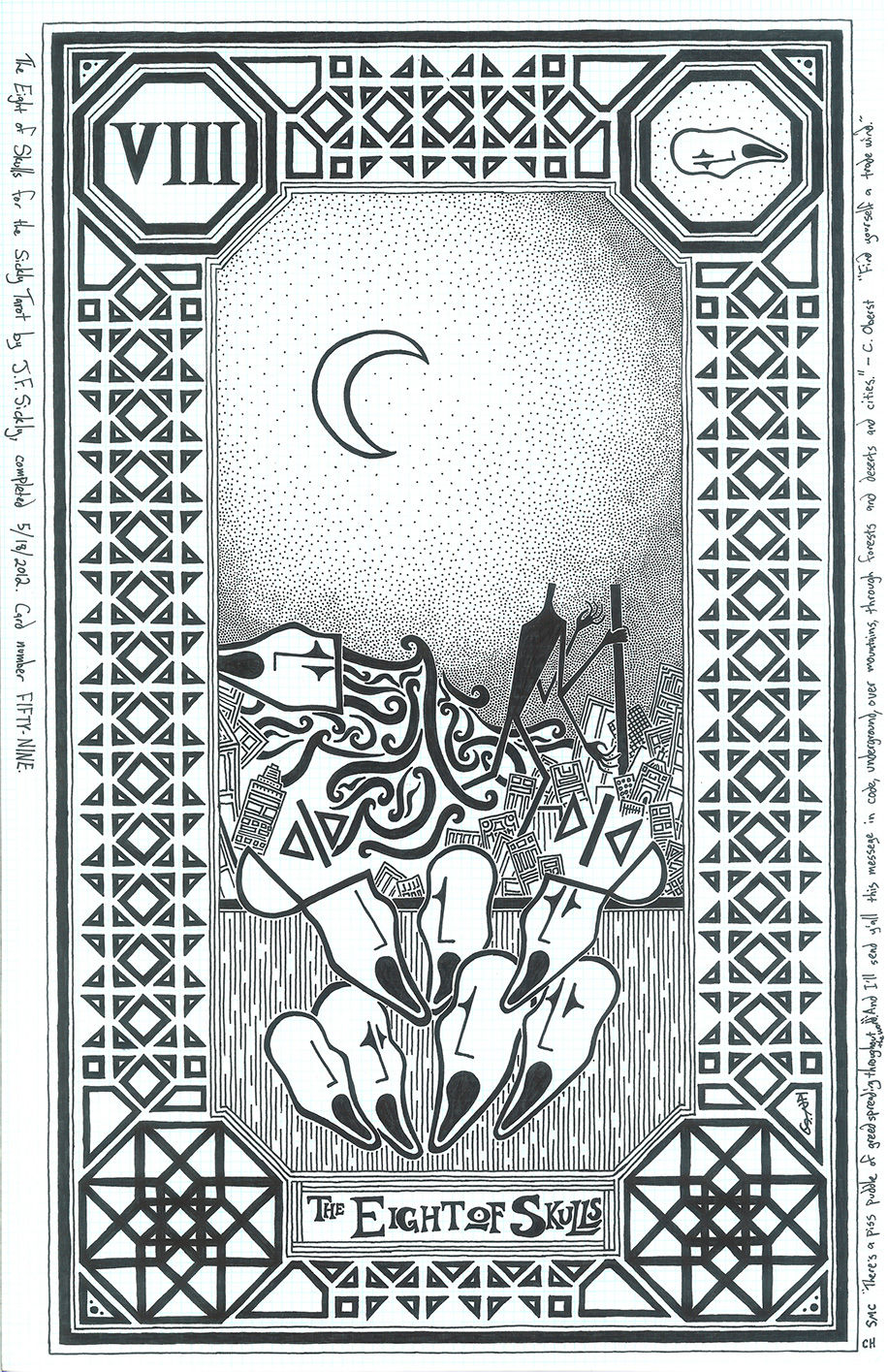 The art from the Sickly Tarot comprise 110 original drawings completed by JARS over a ten year period. Using nothing but black gel pens, these illustrations were completed entirely around the concept "pen to paper" - no pencil marks as a guide, no straight edge or rulers, no tracing, no white-out. The closest form of guide are (usually) 2 rough drafts per face at about an eighth of the final size (11 x 17 inch) and the cyan grid of Canson eighth-inch graph paper.