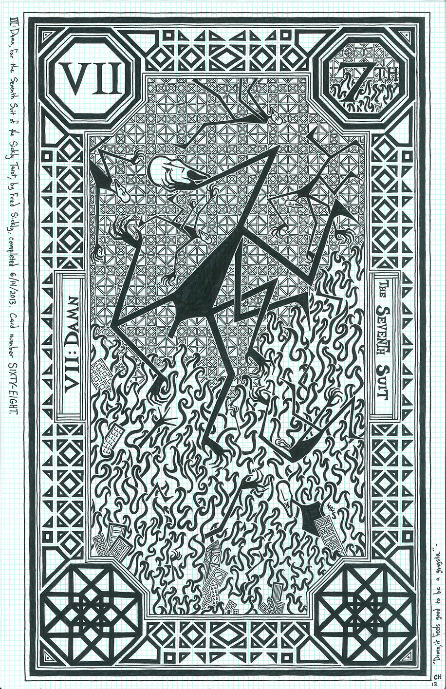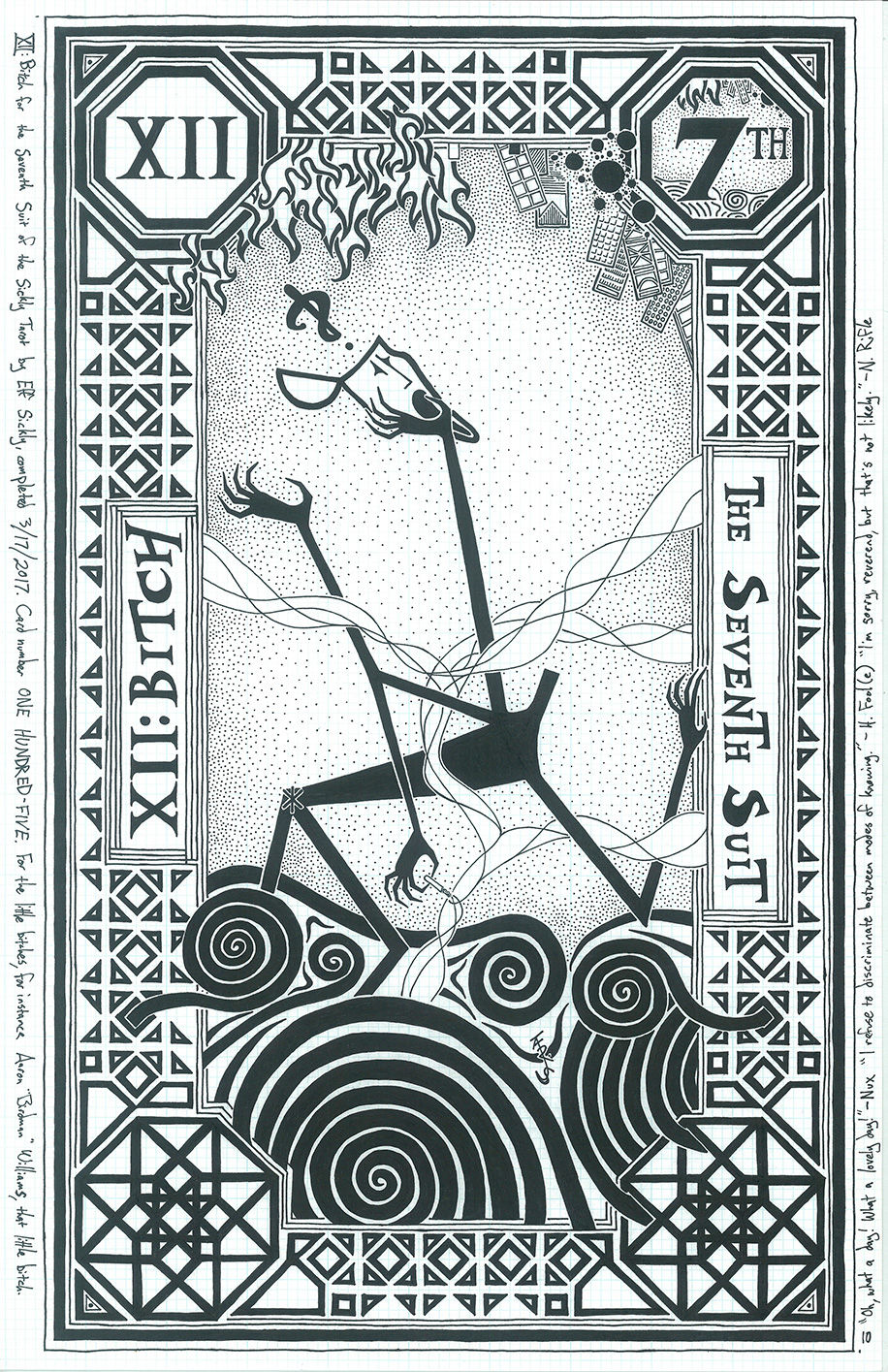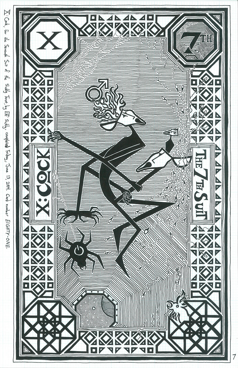 The art from the Sickly Tarot comprise 110 original drawings completed by JARS over a ten year period. Using nothing but black gel pens, these illustrations were completed entirely around the concept "pen to paper" - no pencil marks as a guide, no straight edge or rulers, no tracing, no white-out. The closest form of guide are (usually) 2 rough drafts per face at about an eighth of the final size (11 x 17 inch) and the cyan grid of Canson eighth-inch graph paper.