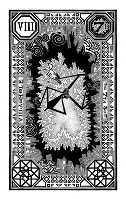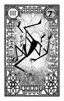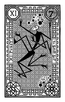 Early on, this suit wasn’t much more than sort of a joke, but it evolved into more. It took over eight years of work before all of the cards were named, ordered and defined. F. Sickly drew this suit partially because there were still themes, yet unaddressed by the standard deck that didn’t fit into the Sickly Suit. But also because very few tarot decks address vulgarity in any serious way, if at all, in any way. There are some decks whose backbone is vulgarity, even more than it is the backbone of this suit. While these “obscene” words are the mode of this suit, their obscenity and frivolity are not the whole story. Their suppression and censorship, and their pure utility as words in the English language are also key to this suit. There is a time and place for most words, in most peoples’ lives. Words define aspects of our environment and things within it. These words have as much a place in the world as their “more polite” counterparts. The use of these words is not always rude or mean-spirited. In addition to being a cathartic set of expletives, they can also serve as useful superlatives, or convey a whole spectrum of different attitudes toward the subject they are describing, from crassness or playful amusement to mockery or utter disdain. Each of these words have the ability to describe a variety of different things, depending on the context, in ways that not many other sets of words can, and most can take the form of verb, adverb, adjective, or noun, in ways that most words in the English language can’t quite manage. These cards are all meant to cover many, or all, of these meanings, uses, and contexts. As with the Sickly Suit, they are also designed to have counterparts in the Major Arcana as well.